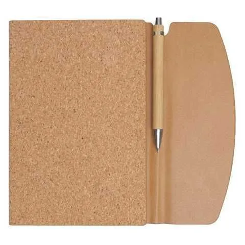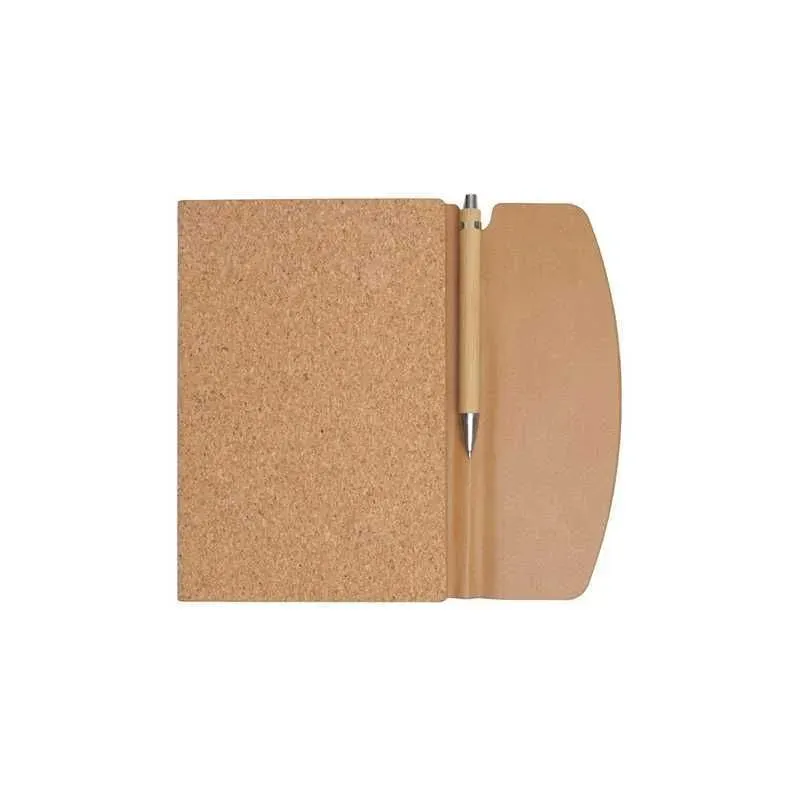 Agenda elaborada en corcho con detalle circular de bambú, perfecta para campañas institucionales y programas de Responsabilidad Social Empresarial, destacando el uso de materiales renovables.