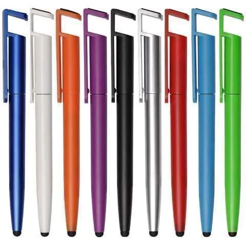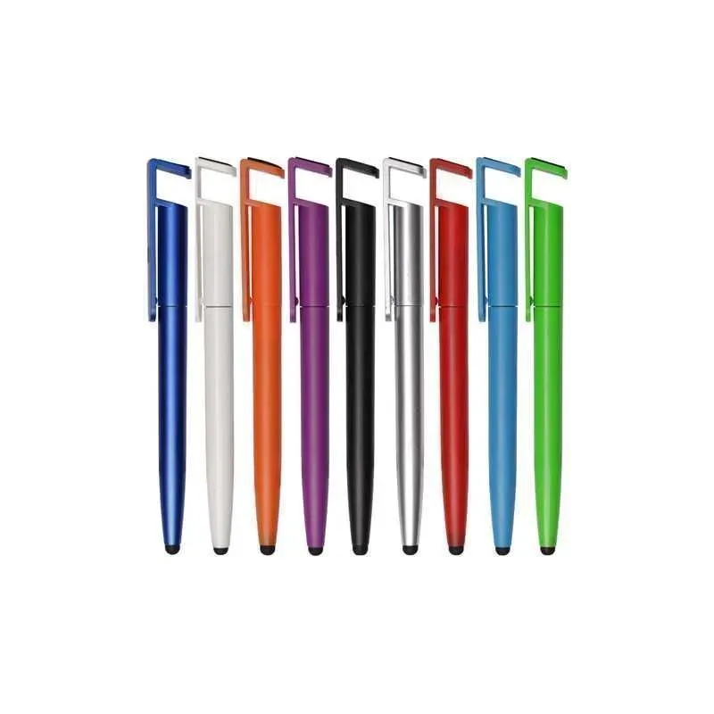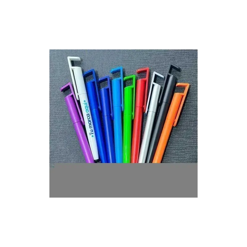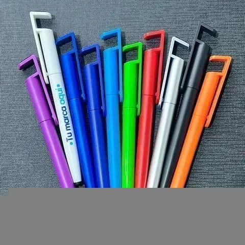 Bolígrafo multifuncional que combina escritura, función touch para pantallas y porta celular en una sola pieza, pensado para facilitar el uso diario y aportar practicidad en cualquier momento.
