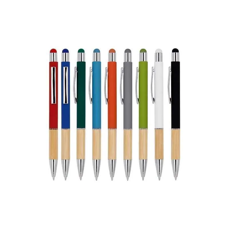 Bolígrafo de bambú con detalles metálicos y punta touch, disponible en varios colores. El cuerpo ofrece un contraste agradable entre lo natural y lo funcional.