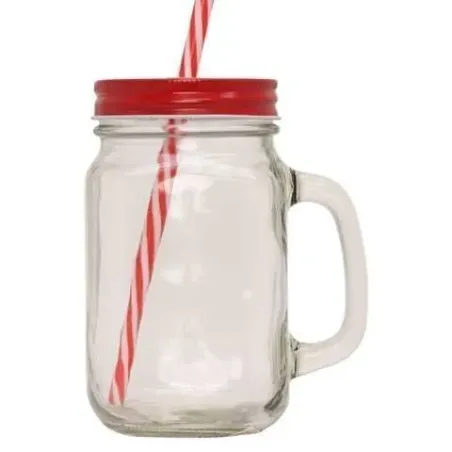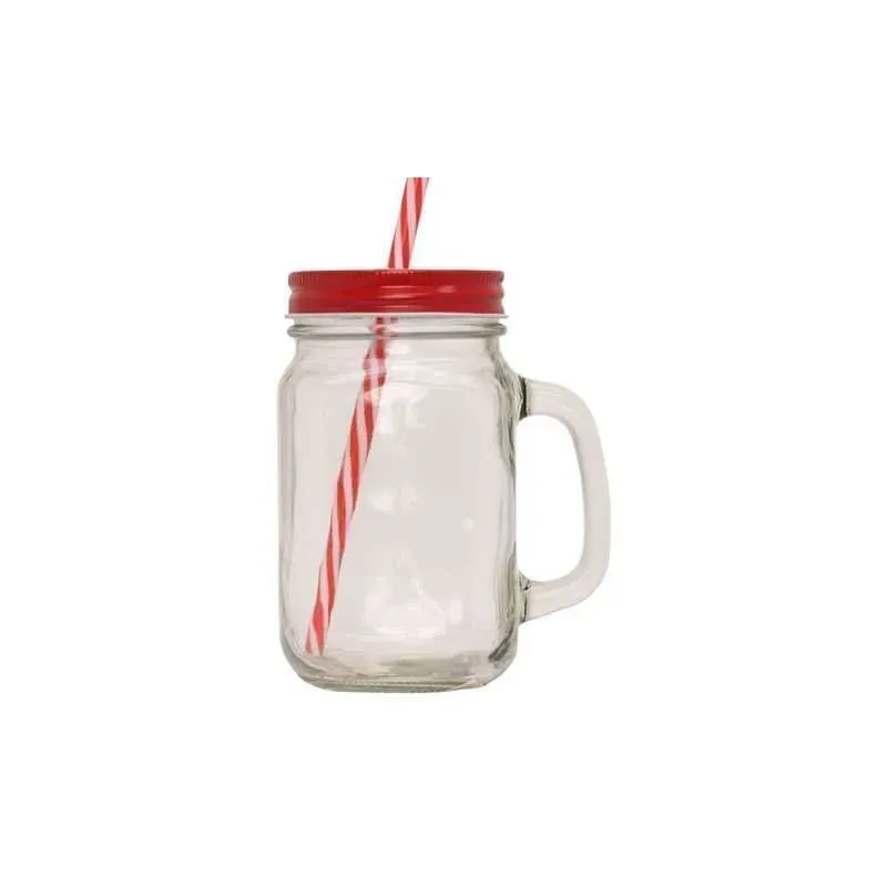 Este jarro de vidrio combina el encanto rústico con la funcionalidad actual. Su tapa metálica y sorbete a rayas añaden un toque festivo a cualquier bebida. Es el soporte ideal para marcas que buscan proyectar frescura, transparencia y un estilo acogedor.