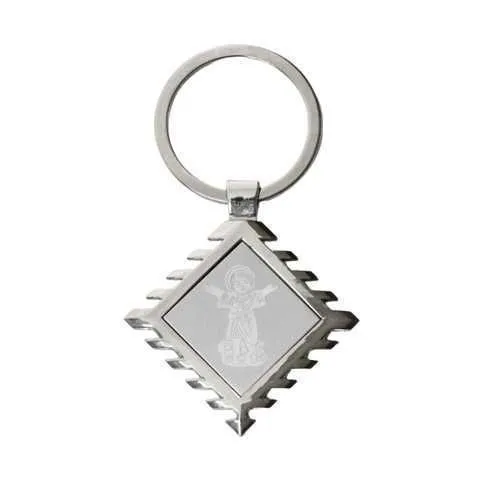Llavero metálico en forma de rombo con cortes que enmarcan la imagen de la Virgen al centro. Una pieza que une protección, fe y elegancia, recordando a quien la porta que cada camino puede recorrerse con confianza, guía y serenidad.
