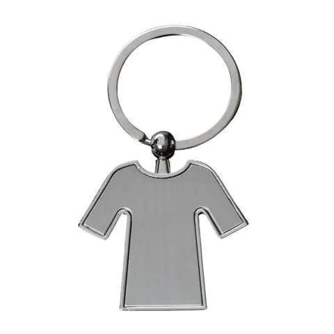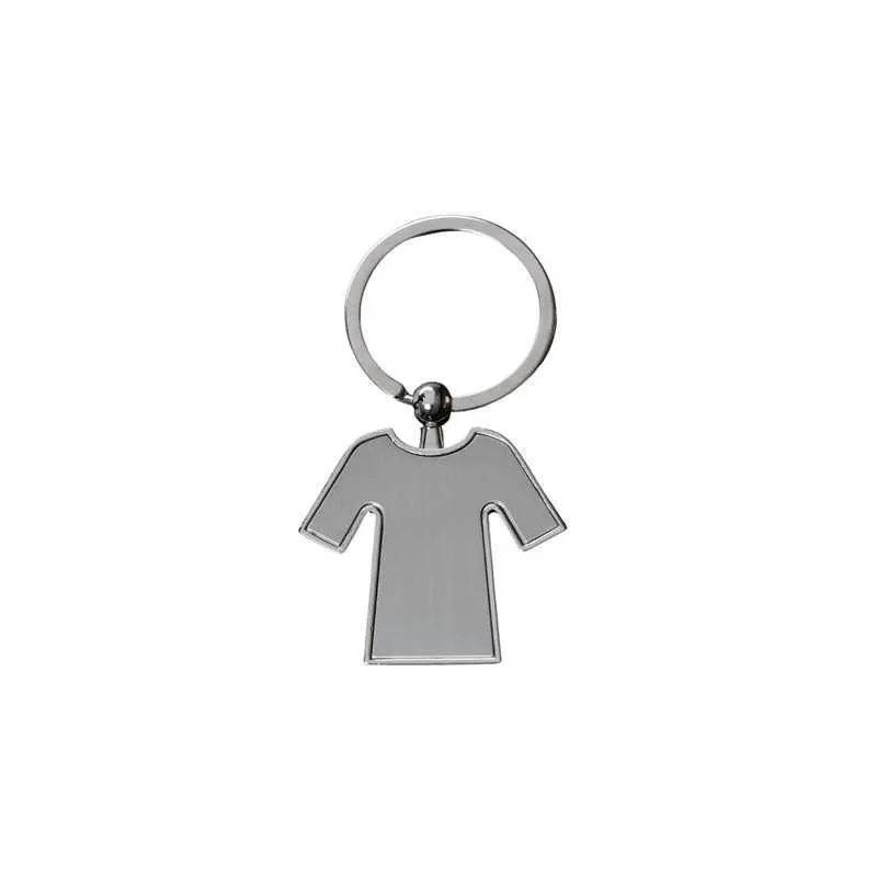 Llavero metálico con silueta de camiseta y borde biselado que enmarca la superficie frontal con precisión. Su forma reconocible y el acabado pulido crean un espacio claro para personalización, proyectando dinamismo, identidad y una presencia visual limpia y bien definida.