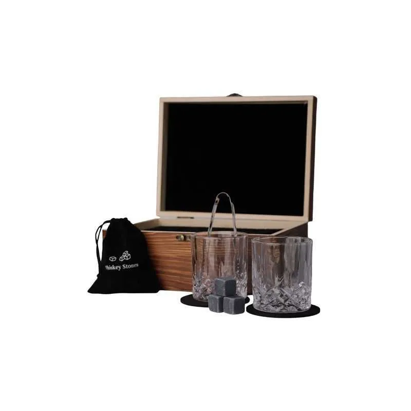 - Incluye: 2 Vasos de Whisky, 1 Pinza, 1 Bolsa, 2 Porta vasos y 8 Piedras