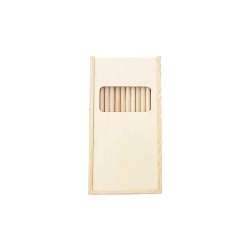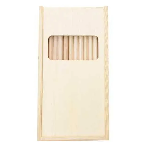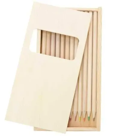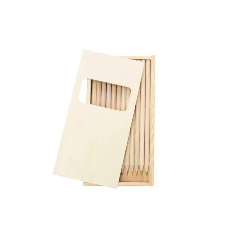 Resguarde su set de doce colores en una caja de madera con sistema de cierre deslizable. El diseño incluye un recorte estratégico que exhibe la gama de colores, ideal para mantener el orden en talleres o entornos escolares. Su acabado natural sin barnices resalta la calidad del material, ofreciendo una solución de almacenaje artística, sobria y de larga vida útil.