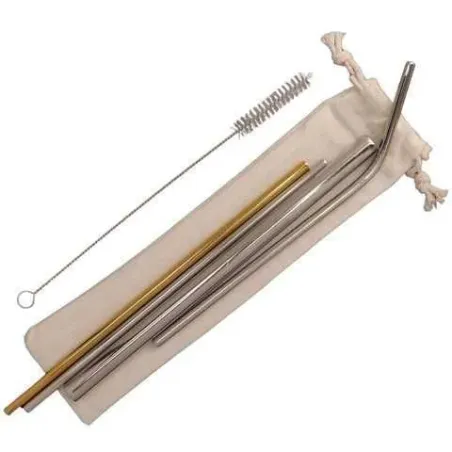 Práctico, estético y 100% reutilizable. Este conjunto destaca por incluir sorbetes en tonos plata y dorado, elevando la imagen de su empresa. Su bolsa de tela facilita el transporte diario, asegurando que su logotipo esté presente en cada momento de refresco.