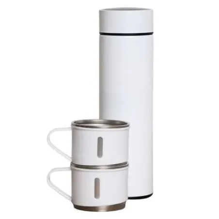 ¿Para qué regalar solo un termo cuando puedes entregar una experiencia completa? Este set blanco minimalista incluye un termo de 500ml con sensor de temperatura táctil y dos tazas metálicas a juego. Es la definición de "quedar bien" con un cliente: utilidad, tecnología y un diseño que grita exclusividad.