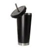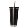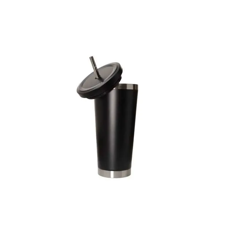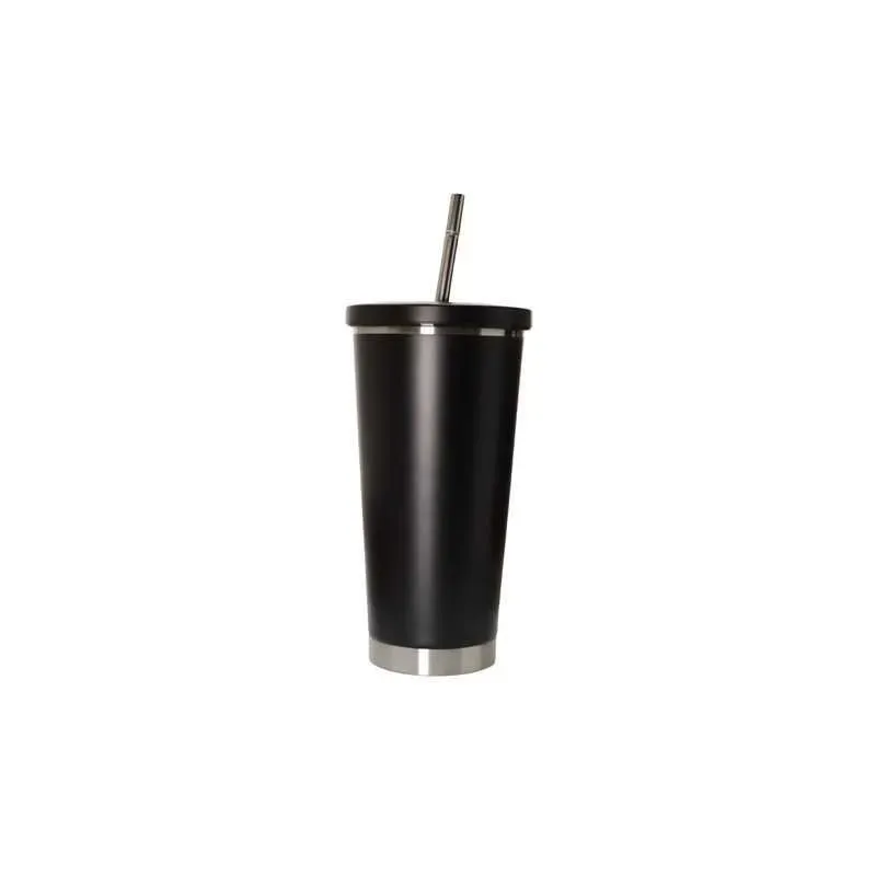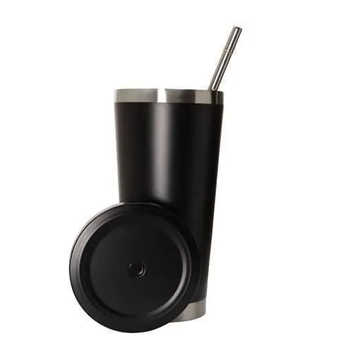 Moderno vaso negro mate con tapa a rosca y sorbete de acero. Su diseño combina durabilidad y sofisticación, siendo el accesorio ideal para mantener tus bebidas perfectas con estilo.